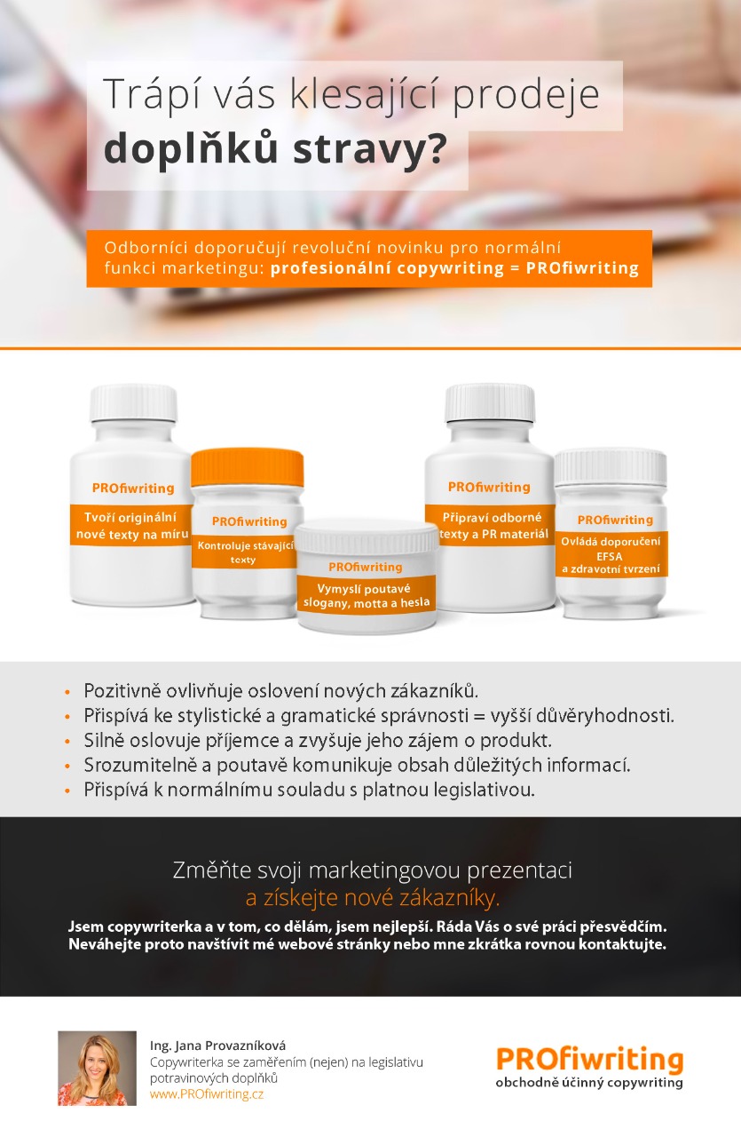 Mám zkušenosti s mnoha tématy z různých oborů. Mou nejuzší specializací jsou texty pro potravinové doplňky, které podléhají specifickým zákonným normám. Máte-li zájem o copywriting na jiné téma, přejděte prosím ke Službám. Pokud však hledáte copywritera pro tuto úzce specializovanou oblast, jsem pro vás ten správný člověk...